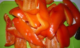 Was de paprika en snijd hem doormidden, denk eraan de plaats af te snijden waar de stengel is bevestigd. Verwijder voorzichtig de zaadjes en snijd elke helft van de paprika in 2-4 stukjes. Schil ook hete pepers van de steel en zaden, snijd ze in kleine cirkels.