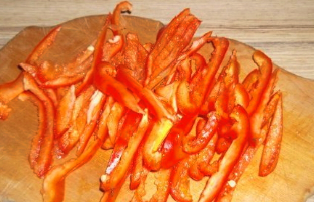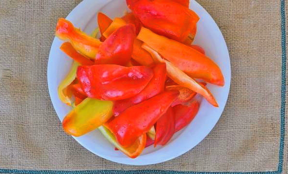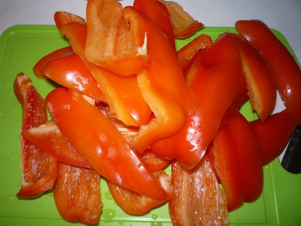 - Was de paprika's en hete pepers, schil ze en hak ze in willekeurige volgorde.