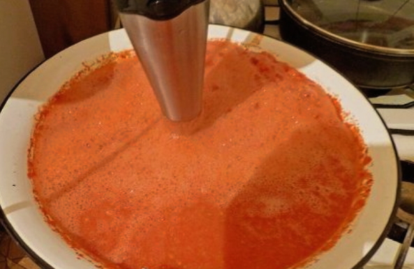 - Zet de blender aan en hak de groenten fijn. Bij afwezigheid van een blender kan deze goed worden vervangen door een vleesmolen. Je zou een homogene, redelijk vloeibare groentemassa moeten hebben. Breng het over in een pan en steek het in brand. Als de massa kookt, giet je er 50 milliliter azijn in, voeg je een theelepel zout en 100 gram kristalsuiker toe. Meng alles goed. Nu moet je het vuur tot bijna het minimum verlagen en de groenten ongeveer 25 minuten laten sudderen.