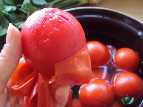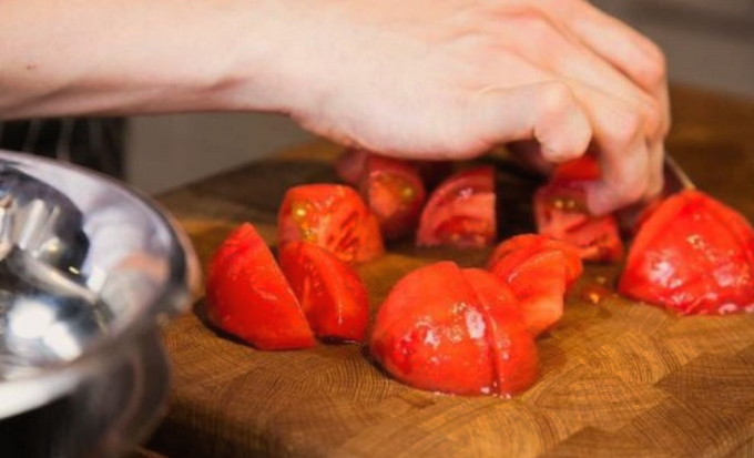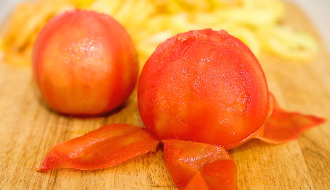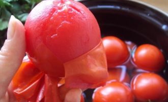 Tomaten moeten worden geschild, maar was ze eerst goed in koud water. Maak vervolgens een kruisvormige insnijding aan de bovenkant en dompel de tomaten afwisselend in kokend water en vervolgens een paar minuten in koud water. Na dergelijke manipulaties zou u ze gemakkelijk moeten kunnen schoonmaken.