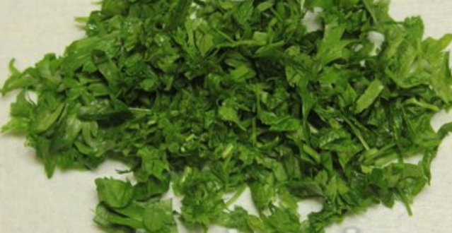 - Was de peterselie en hak fijn. Voeg toe aan gehakte groenten. Voeg daar een half glas zout, zonnebloemolie, piment en 10 laurierblaadjes toe. Meng alle ingrediënten goed.