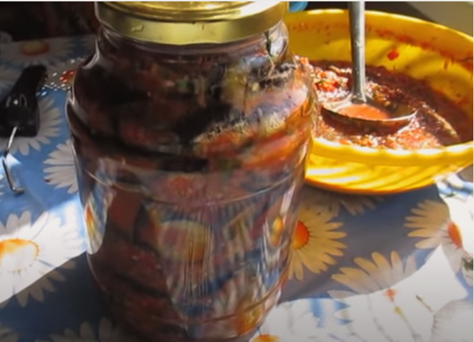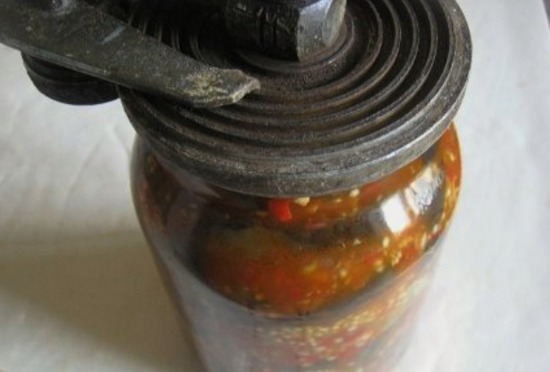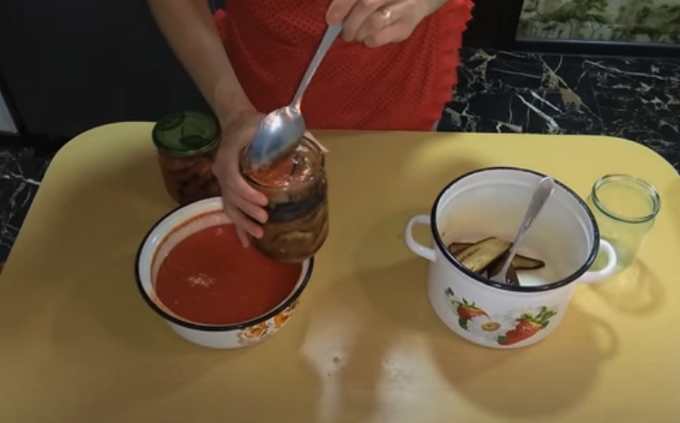 - Leg in gesteriliseerde potten tot 1 liter de aubergine en saus in lagen. Plaats de deksels op de potten en plaats de potten in een grote pan. Giet voldoende water in de pot zodat de blikjes bijna helemaal onder staan (laat 2 tot 3 centimeter tot de rand). Nadat het water in de pan kookt, kook je de ingeblikte snack in kokend water gedurende 20 minuten.