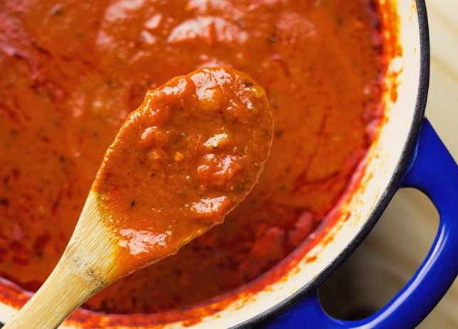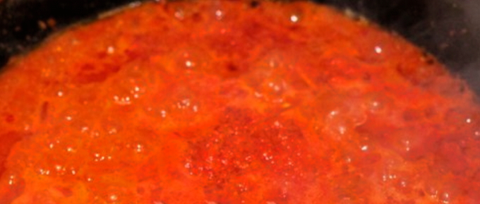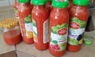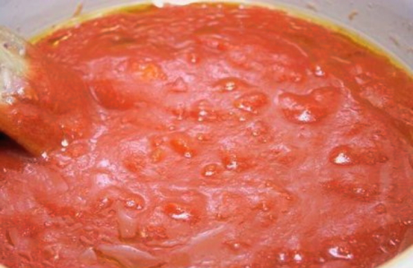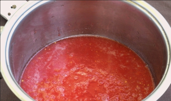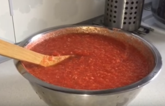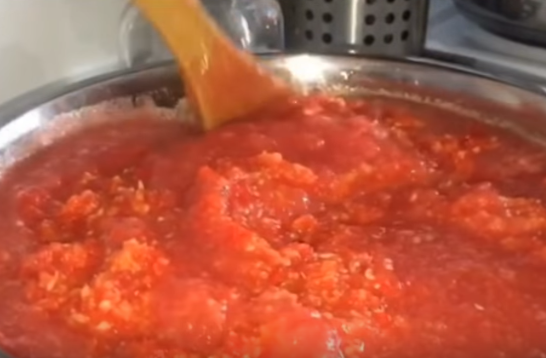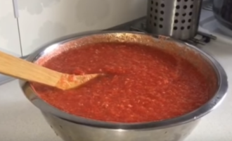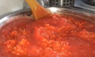 - Maal de zwarte en pimenterwten fijn met een koffiemolen. Voeg het resulterende mengsel toe aan de tomatenpuree. Giet het resterende zout en 20 gram kristalsuiker erbij. Roer goed en zet de pan op het vuur. Als de tomaten koken, zet je het vuur lager en laat je het sap ongeveer 30 minuten sudderen.