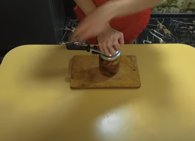 - Rol de blikken met tinnen deksels op en draai ze om. Om het conserveringsproces correct te laten verlopen, moet u de potten afdekken met een deken. Het is in deze staat dat ze moeten afkoelen.