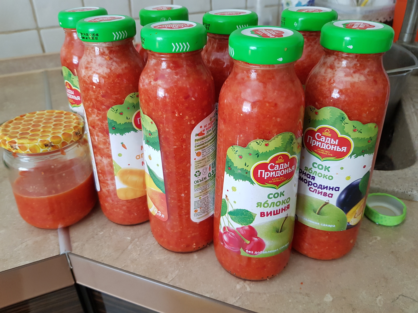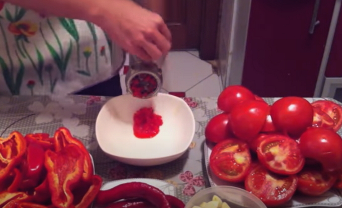 - Spoel de tomaten onder stromend water, snijd ze in 2 delen en snij de plek waar de steel zat eruit. Was de paprika's en verwijder vervolgens de zaadjes en steeltjes. Als de paprika groot is, snijd hem dan in 4 delen, een kleine paprika is voldoende om hem doormidden te snijden. Schil en snijd de hete peper op dezelfde manier als paprika. Pel de knoflookteentjes. Nu heb je een vleesmolen of blender nodig (maar een vleesmolen heeft nog steeds de voorkeur). Wervel knoflook, tomaten en beide paprika's erdoorheen. Je krijgt een plantaardige massa die qua aroma en uiterlijk op adjika lijkt.
