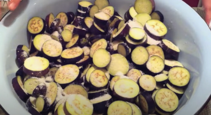 In dit recept is het belangrijk om de aubergine goed te bereiden. Was ze hiervoor goed onder stromend water. Snijd het deel af waar de steel zat en snijd de aubergines in cirkels van niet meer dan 1 centimeter breed. Doe de aubergineplakken in een diepe, grote pan en bestrooi met zout. Nu moet je de aubergines met zout mengen en ze een half uur laten staan, zodat ze de tijd hebben om het sap een beetje af te tappen en er onnodige bitterheid uit komt. Haal na 30-40 minuten de auberginestukjes uit de pan en spoel ze af met voldoende stromend water om het zout er volledig af te spoelen. Zet de gewassen aubergine opzij.