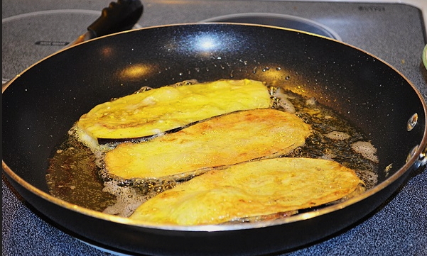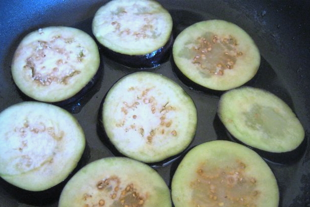 - Verhit de koekenpan en bestrijk met een beetje geraffineerde zonnebloemolie. Bak de aubergine aan beide kanten tot ze bijna gaar zijn.