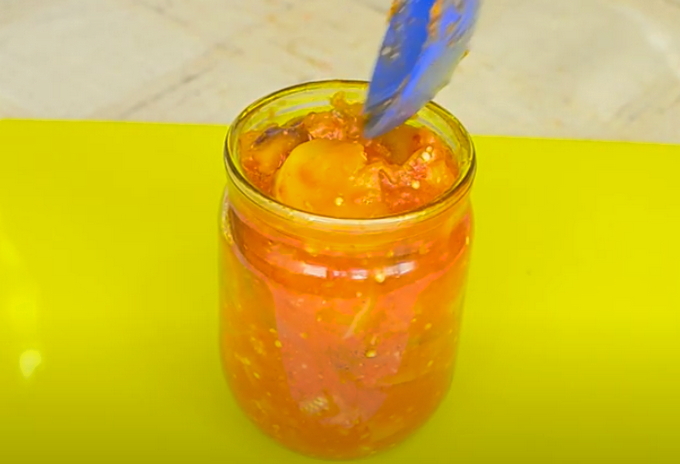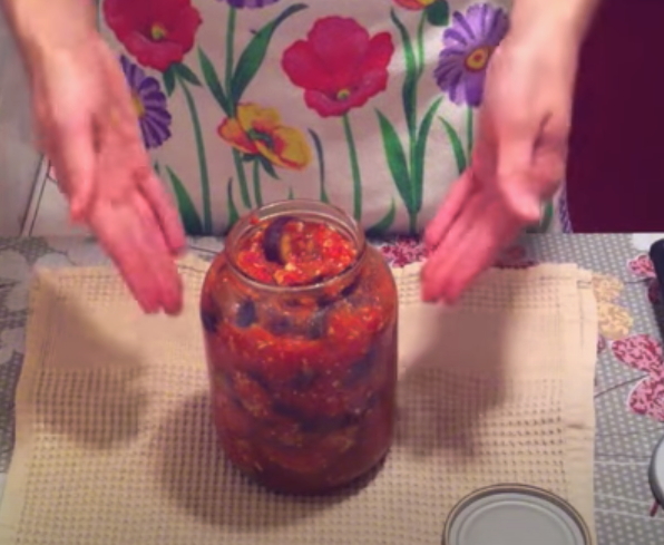 - U kunt beginnen met het vullen van de blikken. Leg hiervoor afwisselend een laag adjika, een laag gebakken aubergine, een laag adjika, een laag aubergine, enz. merk op dat de laatste laag adjika moet zijn. Voeg voor het sluiten van de potten met deksels aan elk van hen een eetlepel ongeparfumeerde plantaardige olie toe.