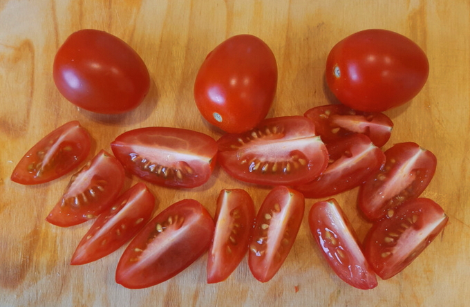 - Was de tomaten, verwijder de steeltjes en snijd elke tomaat in 4-6 stukjes, afhankelijk van de grootte.