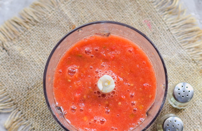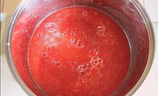 - De tomaten moeten worden gewassen en er worden kruisvormige sneden bovenop gemaakt.Dompel vervolgens elke tomaat afwisselend ongeveer 2,5 minuten in een pan met heet water. Na dergelijke manipulaties kan de schil gemakkelijk worden verwijderd. Snijd de gepelde tomaten in kleine stukjes. Daarna moeten de tomaten worden overgebracht naar een blenderkom en worden gehakt tot tomatensap.