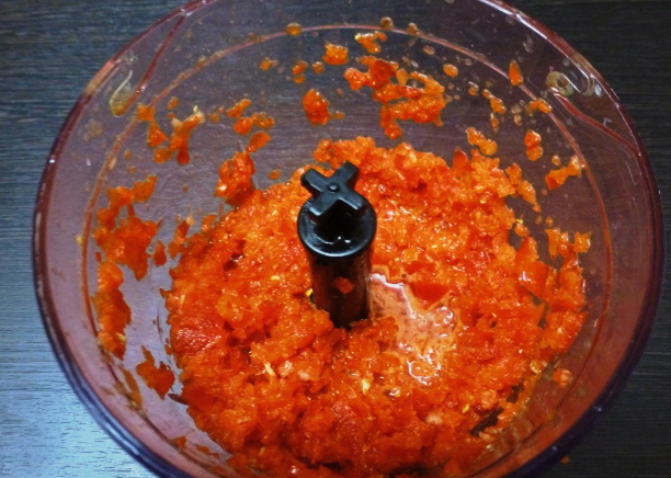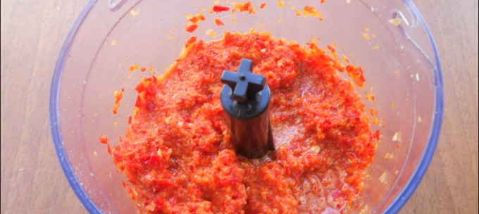 - Pel de knoflook, spoel de zoete en hete pepers af en verwijder de steeltjes en zaadjes. Snijd de peperkorrels in 4 stukken, maal vervolgens de knoflook en twee paprika's in een vleesmolen (een blender of keukenmachine werkt voor hetzelfde doel).