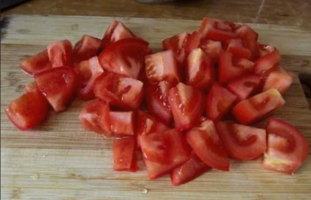 - Was de tomaten, snijd de steel af en snijd de tomaten in kleine stukjes.