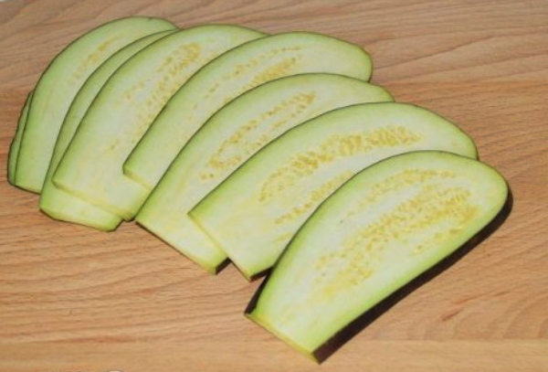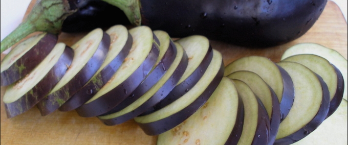 - Terwijl je tijd hebt, bereid je de aubergine voor. Ze moeten onder stromend water worden gewassen en een beetje worden afgesneden van de kant waar de stengel is bevestigd. Snijd de aubergine met een scherp mes in dunne plakjes.