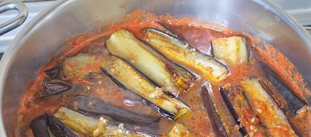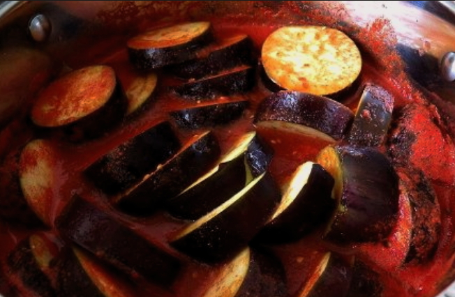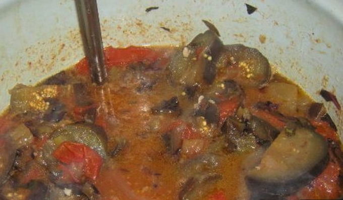 - Wanneer de aangegeven 25 minuten zijn verstreken, breng je de aubergineplaten over in de groentepuree. Wacht tot de groenten weer koken en laat ze 25 minuten op laag vuur onder voortdurend roeren sudderen.