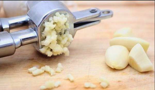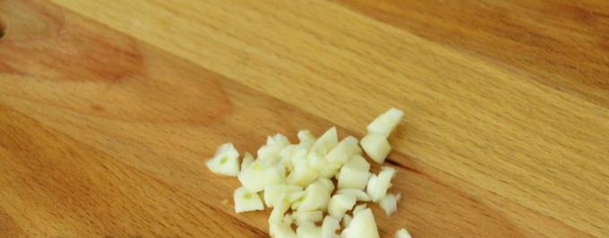 - Pel en hak de knoflookteentjes. Dit kan met een mes of een speciale pers, of door de knoflook op een fijne rasp te wrijven. Voeg 5 minuten voor het einde van de aangegeven tijd gehakte knoflook toe aan de aubergines in tomatensaus.