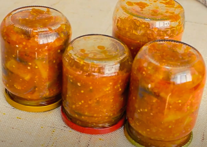 - Terwijl de groenten aan het stoven waren, was het noodzakelijk om met soda te wassen en de potten boven de stoom te houden. Doe de voorbereide salade in schone potten en sluit de potten onmiddellijk af met deksels. Wikkel de hete saladepotten nu stevig in met een deken of deken en wacht tot ze volledig zijn afgekoeld. Na ongeveer 12 uur moeten de potten zijn afgekoeld en kunnen ze op een koele plaats worden bewaard.