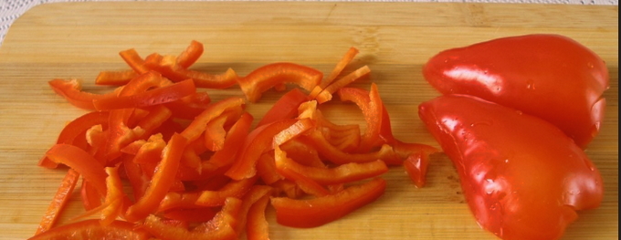 - Was de paprika's en verwijder de zaadjes. Spoel de binnenkant van de paprika en snij in kleine reepjes. De dikte van de strips mag niet groter zijn dan 5 millimeter. Snijd de paprikareepjes in kleine stukjes.