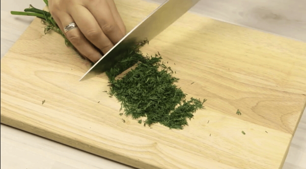 - Week de dille 10 minuten in koud water met zout. Spoel de kruiden daarna goed af onder stromend water en doe ze in een vergiet om overtollig vocht af te tappen. Hak de gedroogde dille fijn en meng met de gebakken uien. Voeg daar 10 gram zout toe en meng goed.