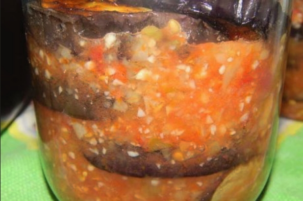 Deze versie van de beroemde "schoonmoedertaal" onderscheidt zich van de andere door de ongebruikelijke manier om aubergines te bereiden. In de afgewerkte schaal blijken ze sterk te zijn en vallen ze niet uit elkaar. Bovendien hoeft deze snack niet gesteriliseerd te worden, dus het kost je heel weinig tijd om hem klaar te maken.