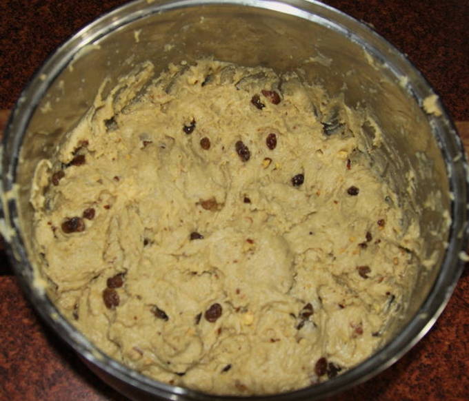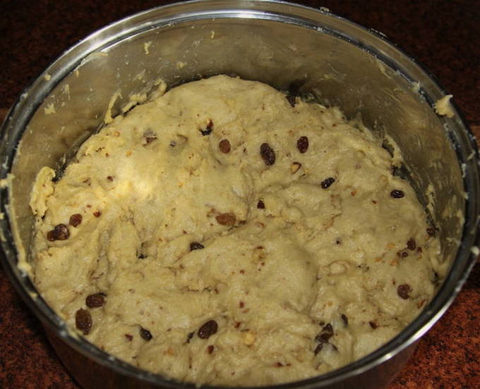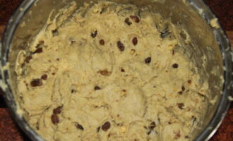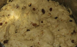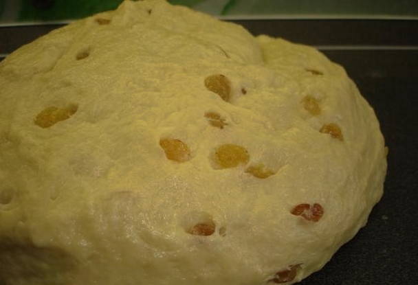 - Verbrand de rozijnen en meng ze door het deeg. We laten het product 2 uur op een warme plaats staan en gebruiken het zoals aangegeven.