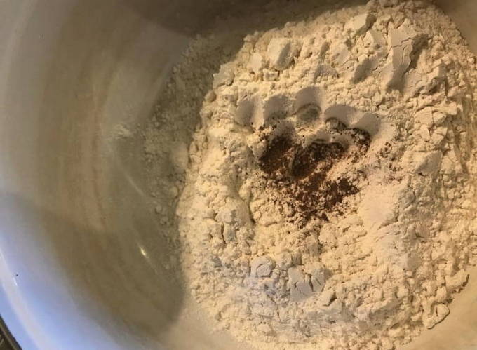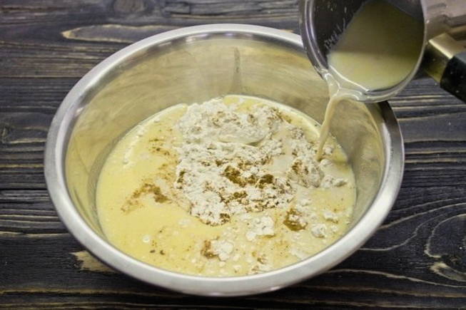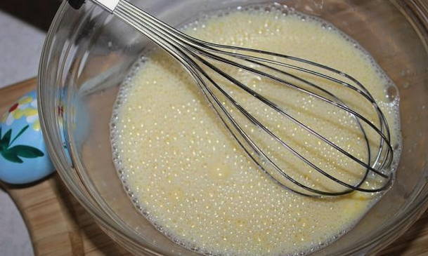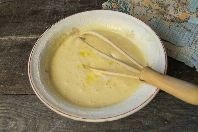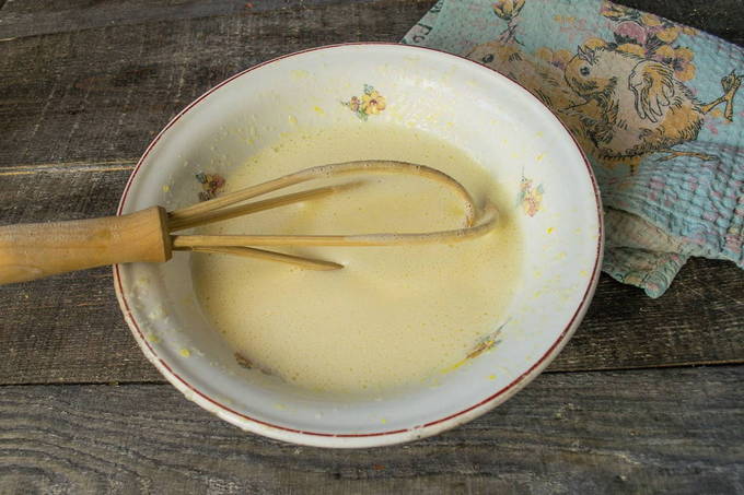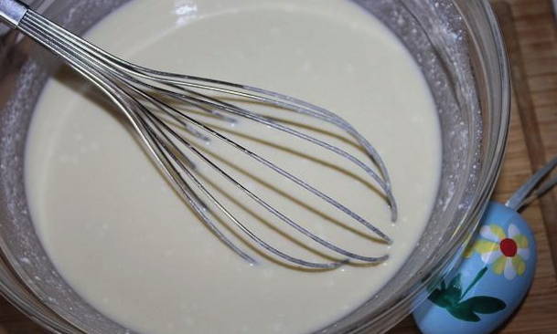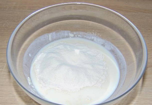 - Schenk de resterende melk in een ander bord. Roer een beetje bloem door het vloeibare product. Er moet een massa uitkomen die lijkt op pannenkoekdeeg.