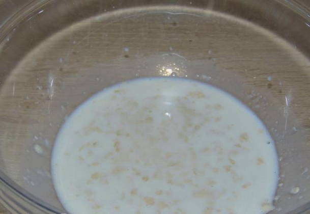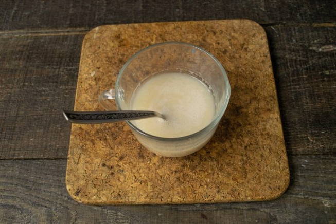 - Breek de rauwe gist in kleine stukjes. Vul ze met twee eetlepels warme melk. Meng grondig en laat 10-15 minuten staan.