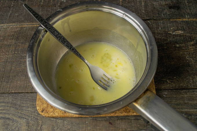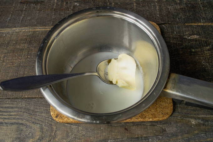 - Verwarm de melk apart en smelt de boter erin.