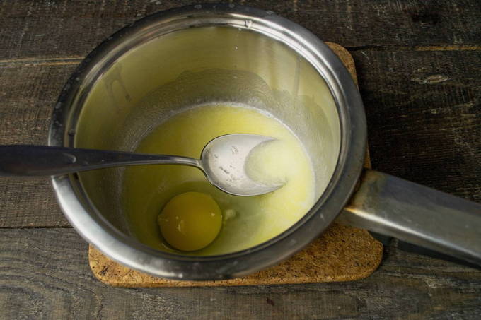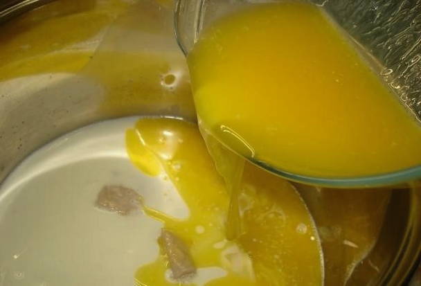 - Giet gesmolten boter bij de geactiveerde gist, maar laat deze eerst iets afkoelen.