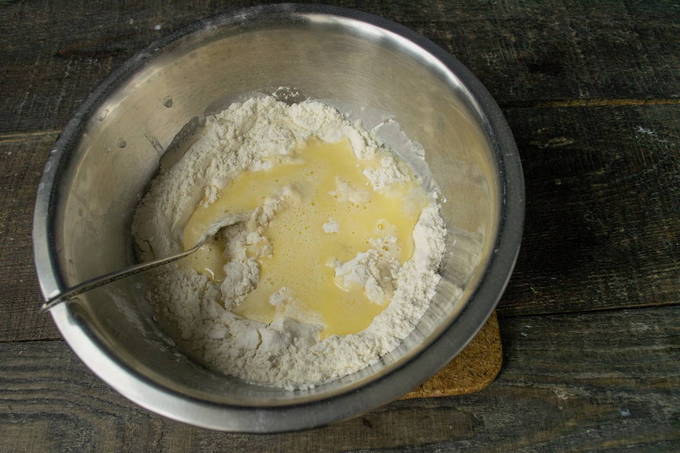 - Giet de afgekoelde olie bij het gistmengsel. Giet hier ei en een beetje cognac in. Roer het voedsel door met een spatel.