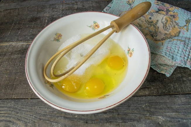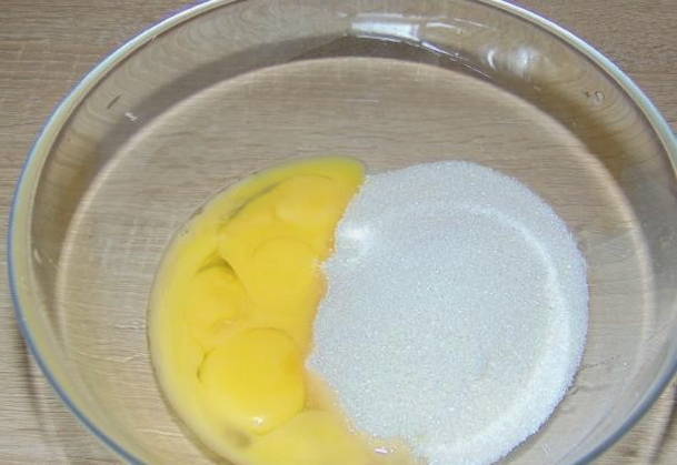 - Breek drie kippeneieren in een diep bord. We verspreiden de benodigde hoeveelheid suiker in dezelfde massa.