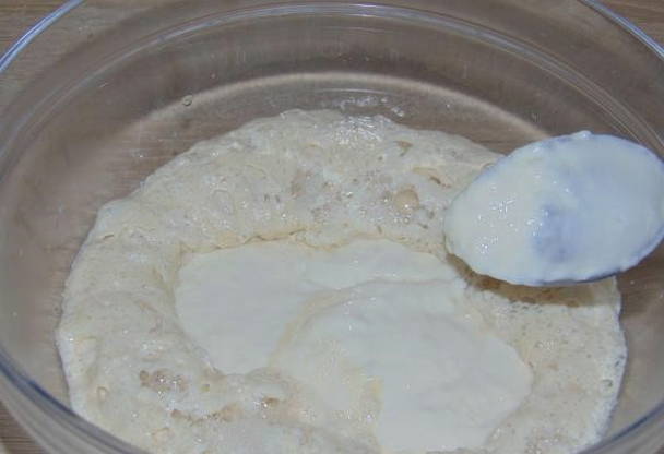 - We beginnen het product ijverig te kneden en er gesmolten boter in te gieten. Delicaat vloeibaar deeg zonder gist is klaar! Gebruik een cakeproduct.