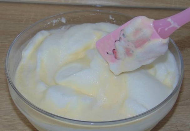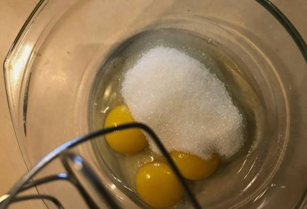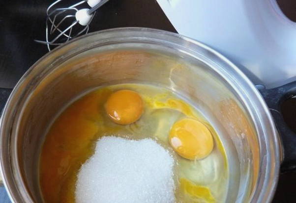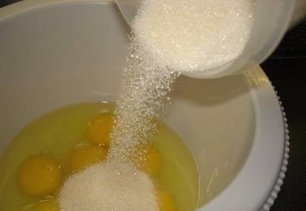 - Combineer kippeneieren en suiker afzonderlijk. Klop de producten tot een gladde massa en het droge ingrediënt is opgelost.