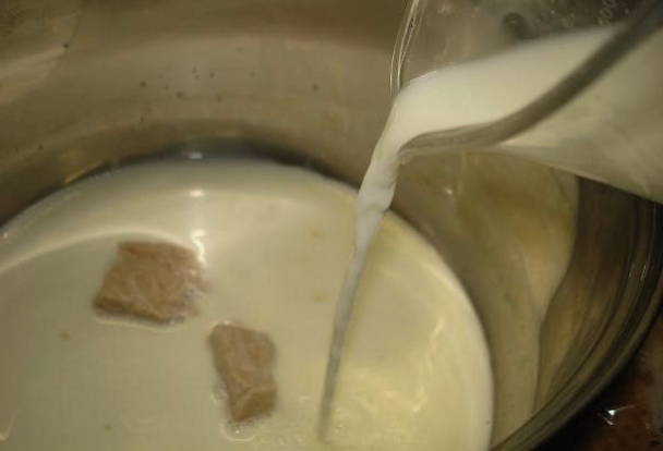 - Breek verse gist in kleine stukjes. Giet het product met warme melk, roer en laat het 15-20 minuten staan tot het geactiveerd is.