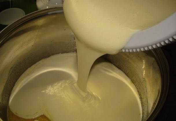 - Verwarm melk en boter apart. Laat het product iets afkoelen en giet het met een dunne stroom in de droge massa.