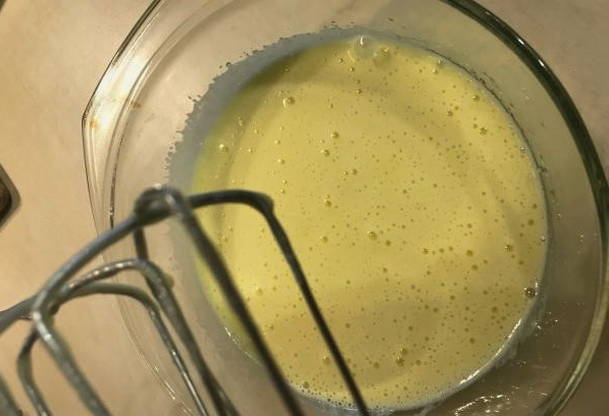 - Klop het ei-suiker mengsel met een mixer tot het wit is.