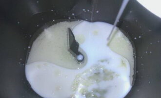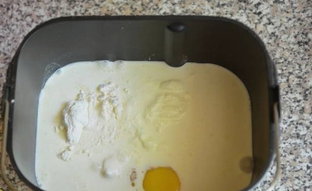 We verwarmen melk in de magnetron of op het fornuis. De temperatuur moet rond de 37°C zijn. Je kunt het controleren door je vinger erin te dopen. Als hij comfortabel is, dan is dit de juiste temperatuur. Giet warme melk in de kom van de broodmachine. Smelt de boter en giet deze bij de melk. Voeg zout toe. Breek de eieren in een aparte kom, schud en voeg toe aan de kom.