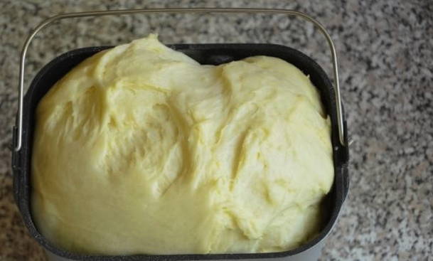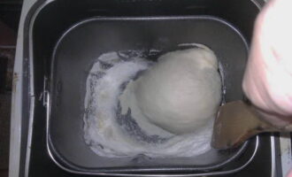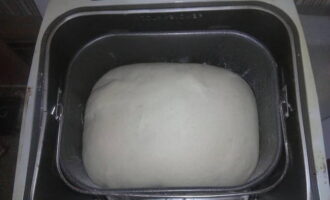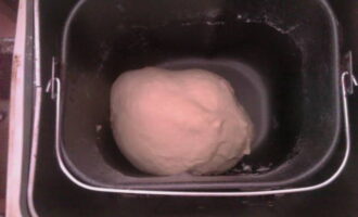 - We zetten de kom met de ingrediënten in de broodbakmachine en kiezen voor het programma "Deeg kneden". We doen er anderhalf uur over. We wachten op het geluidssignaal, openen het deksel en we kunnen beginnen met het vormen van de taarten.