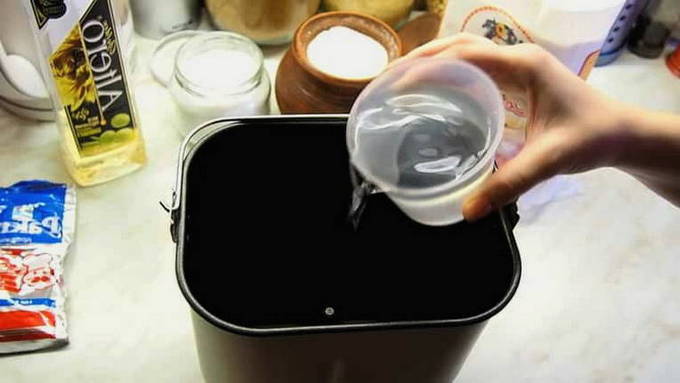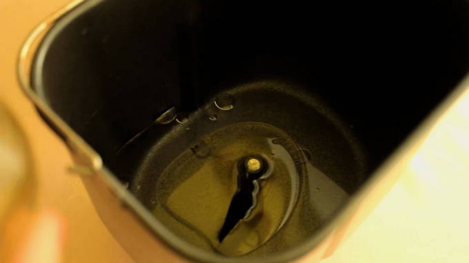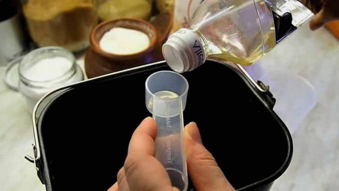 - Giet warm water in de kom van de broodmachine. De temperatuur moet rond de 40 zijnOC. Voeg er vervolgens plantaardige olie aan toe.