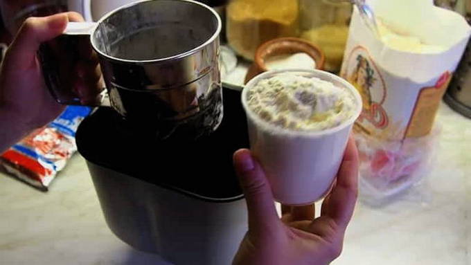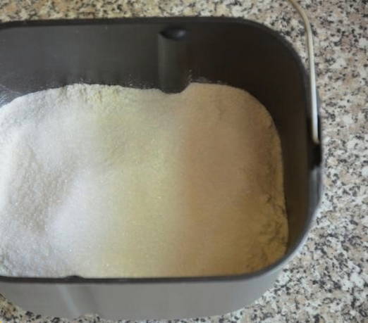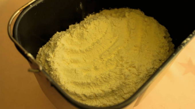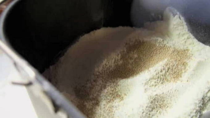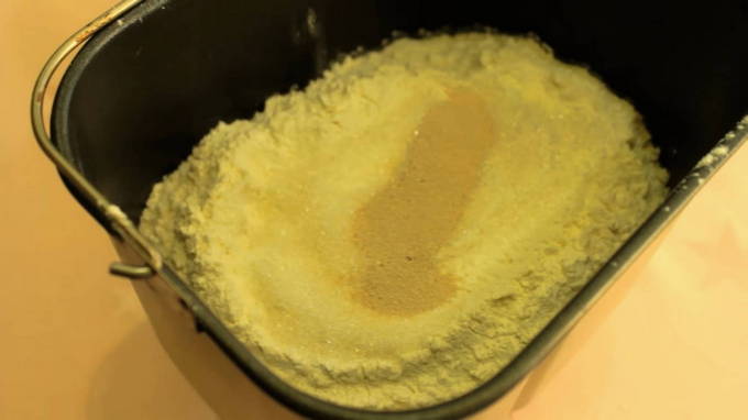- Giet 2 theelepels gist op de bloem. Het belangrijkste in dit recept is om de volgorde te volgen waarin de ingrediënten aan de kom van de broodbakmachine worden toegevoegd.