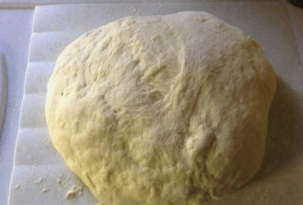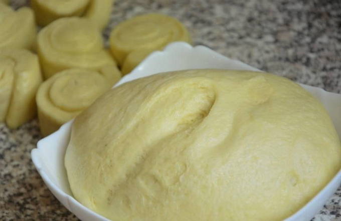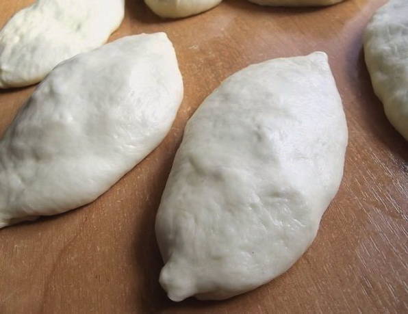 Om te koken hebben we water, suiker, zout, plantaardige olie, bloem en droge gist nodig. Alle ingrediënten gaan anderhalf uur naar de bakkerij. Dit deeg wordt het best gebruikt voor gebakken taarten. Ze blijken poreus en weelderig te zijn.