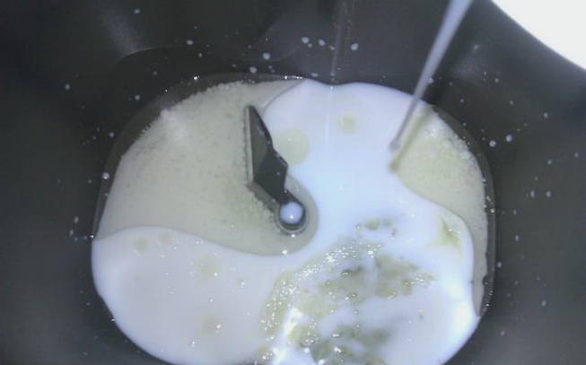 We verwarmen melk in de magnetron of op het fornuis. De temperatuur moet rond de 37°C zijn. Je kunt het controleren door je vinger erin te dopen. Als hij comfortabel is, dan is dit de juiste temperatuur. Giet warme melk in de kom van de broodmachine. Smelt de boter en giet deze bij de melk. Voeg zout toe. Breek de eieren in een aparte kom, schud en voeg toe aan de kom.