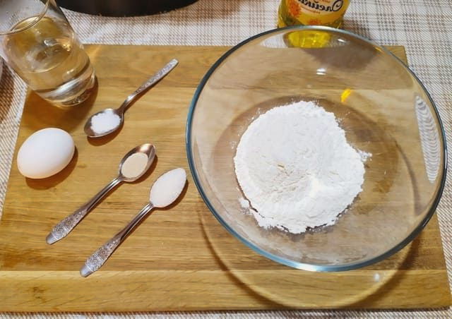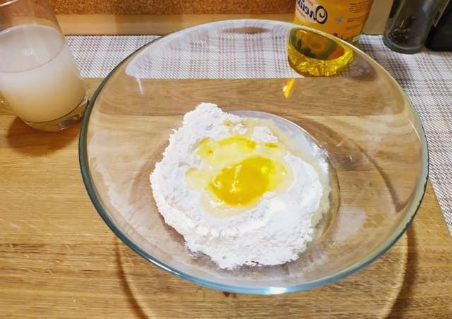 - Combineer bloem met zout in een handige bak, giet water in het midden. Roeren. Giet vervolgens het eiermengsel en de plantaardige olie erin. Meng opnieuw.