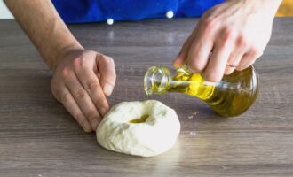 - Voeg vervolgens olijfolie toe en kneed het deeg voorzichtig met je handen. We vormen een gladde en homogene bal. We staan erop 30-40 minuten op een warme plaats.