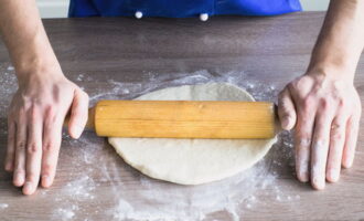 Bestrooi het afgewerkte deeg met een beetje bloem zodat het niet aan de tafel of handen blijft plakken. Rol met een deegroller uit tot een nette dunne bodem.