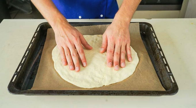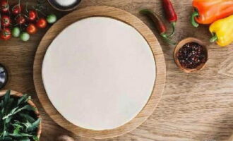 - Rol het deeg uit in de gewenste vorm en leg het op een bakplaat. De basis voor kefir pizza is klaar. Je kunt er de nodige producten op doen en het gerecht bakken.