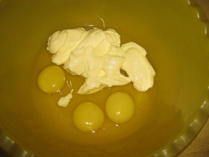 - Breek drie eieren in een diepe kom. Voeg mayonaise toe en klop de producten grondig tot een homogeen mengsel.