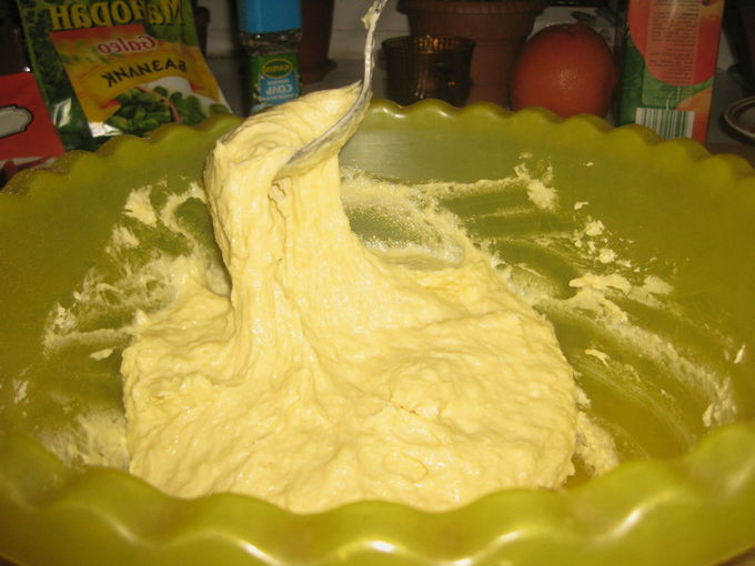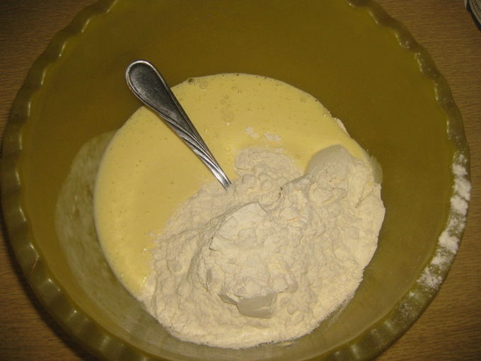 - We verspreiden de zure room in de eieren, zeven hier de bloem en gieten de gesmolten boter. Kneed de massa grondig tot een gladde massa.