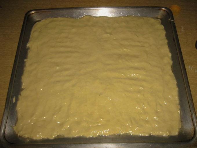 - Het deeg blijkt vrij dik en zacht te zijn. Verdeel het vervolgens over een ovenschaal. Klaar!