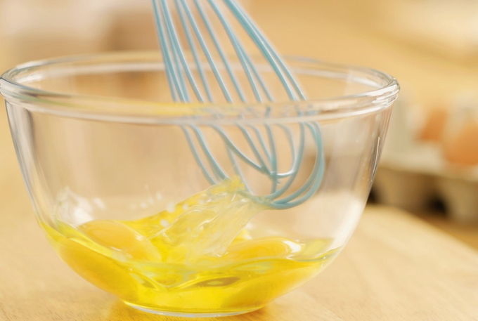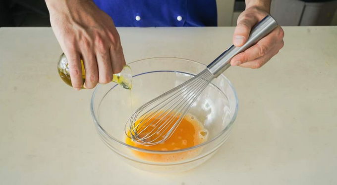 - Klop de eieren met zout en plantaardige olie tot een gladde massa.