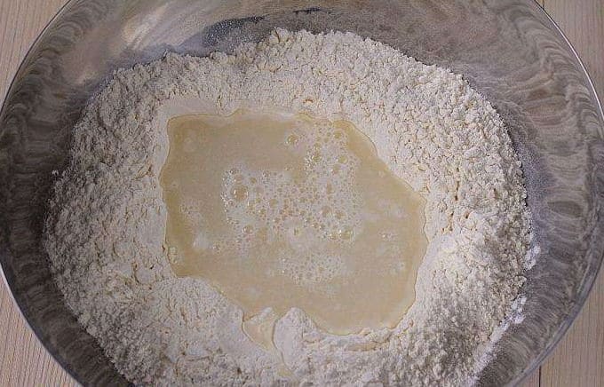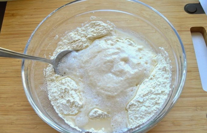 - Vul het deeg met water met geïnfuseerde gist. Roer de massa goed door.